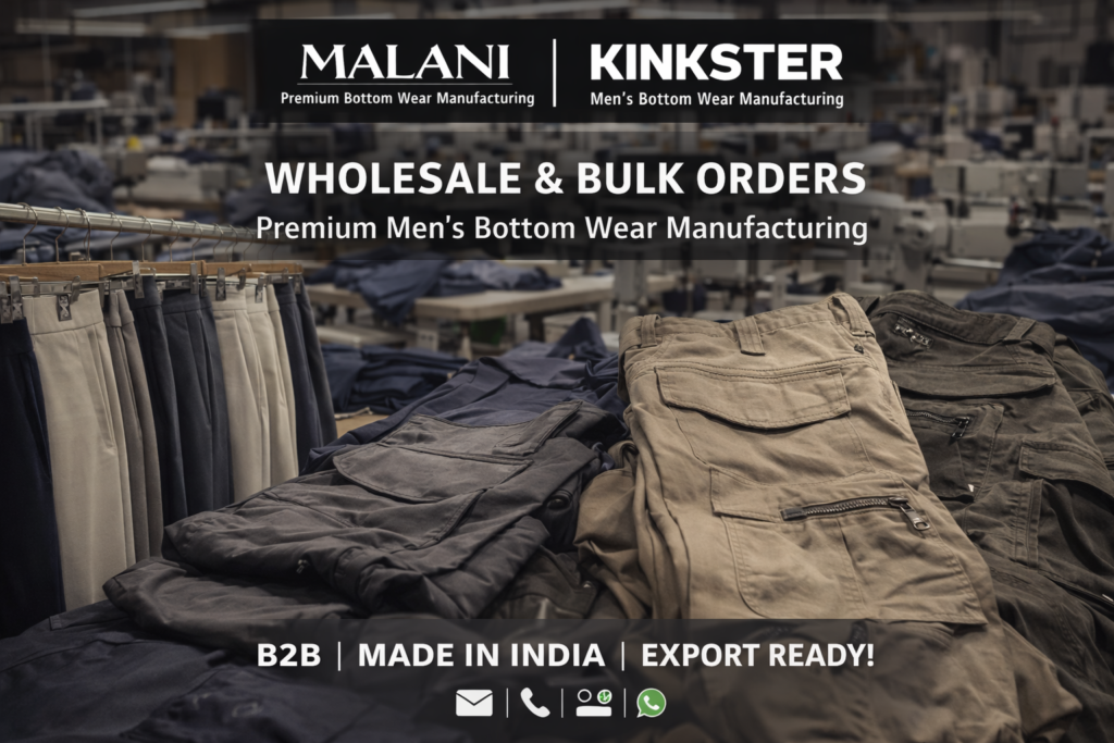 KINKSTER specializes in menswear bottomwear manufacturing, including formal trousers, cargos, chinos, joggers, and imported-style pants for wholesale and bulk buyers.
